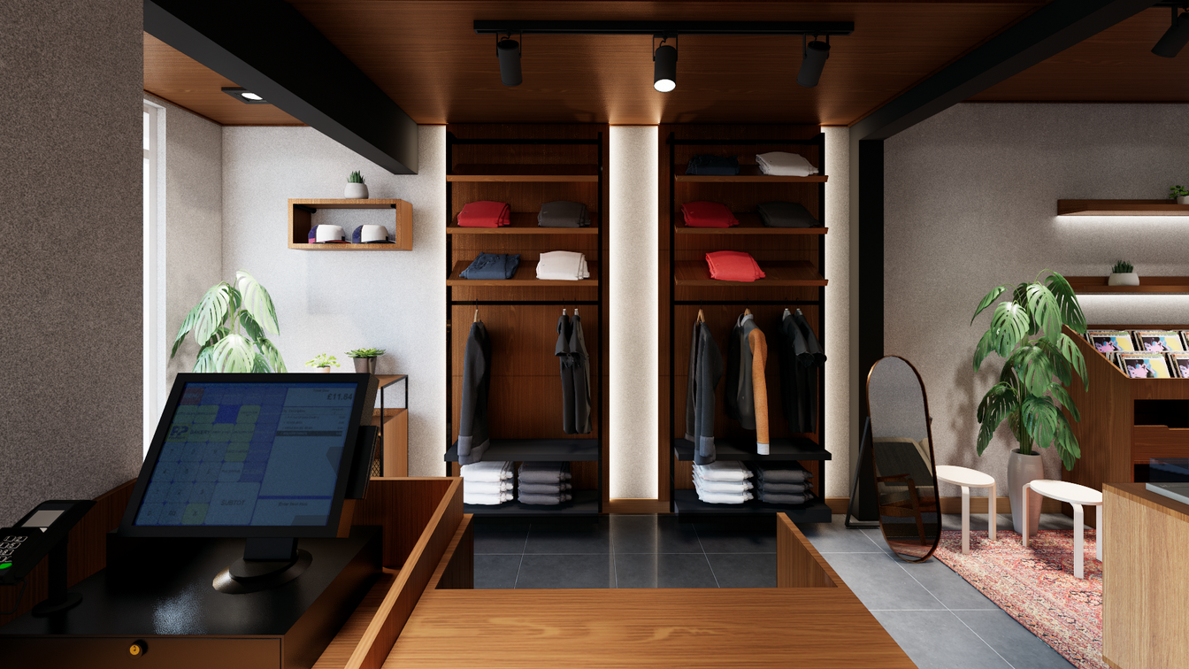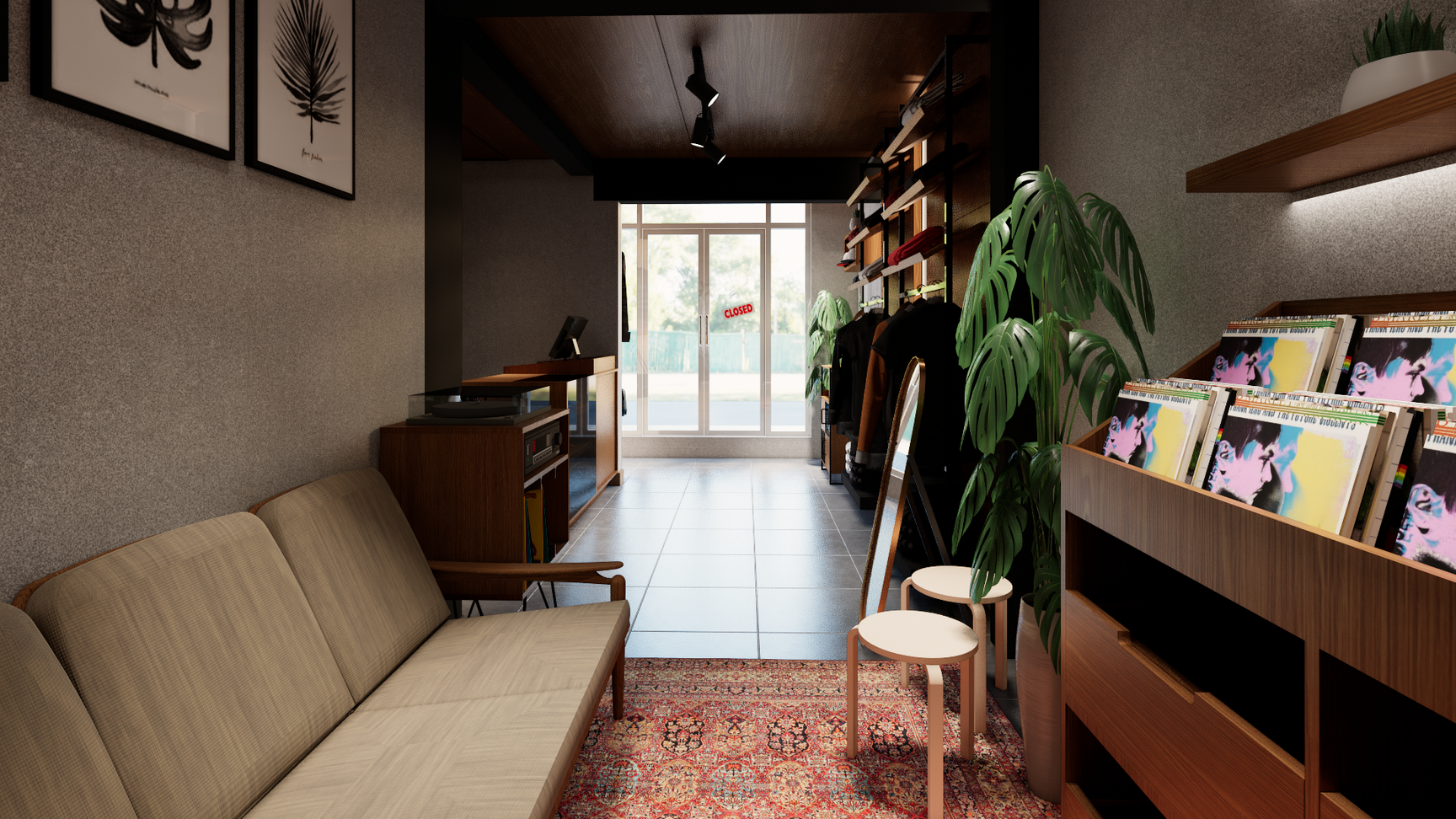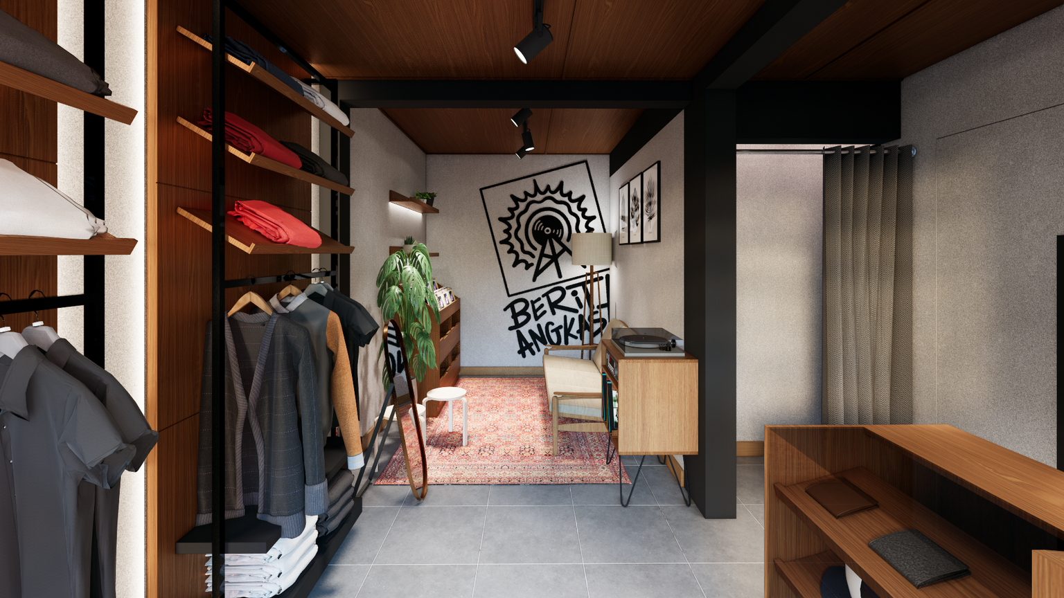 In this project, I became a 3D visualist of the space news retail store design. Carrying a minimalist industrial concept combined with a music approach to support the sale of products related to the music industry.